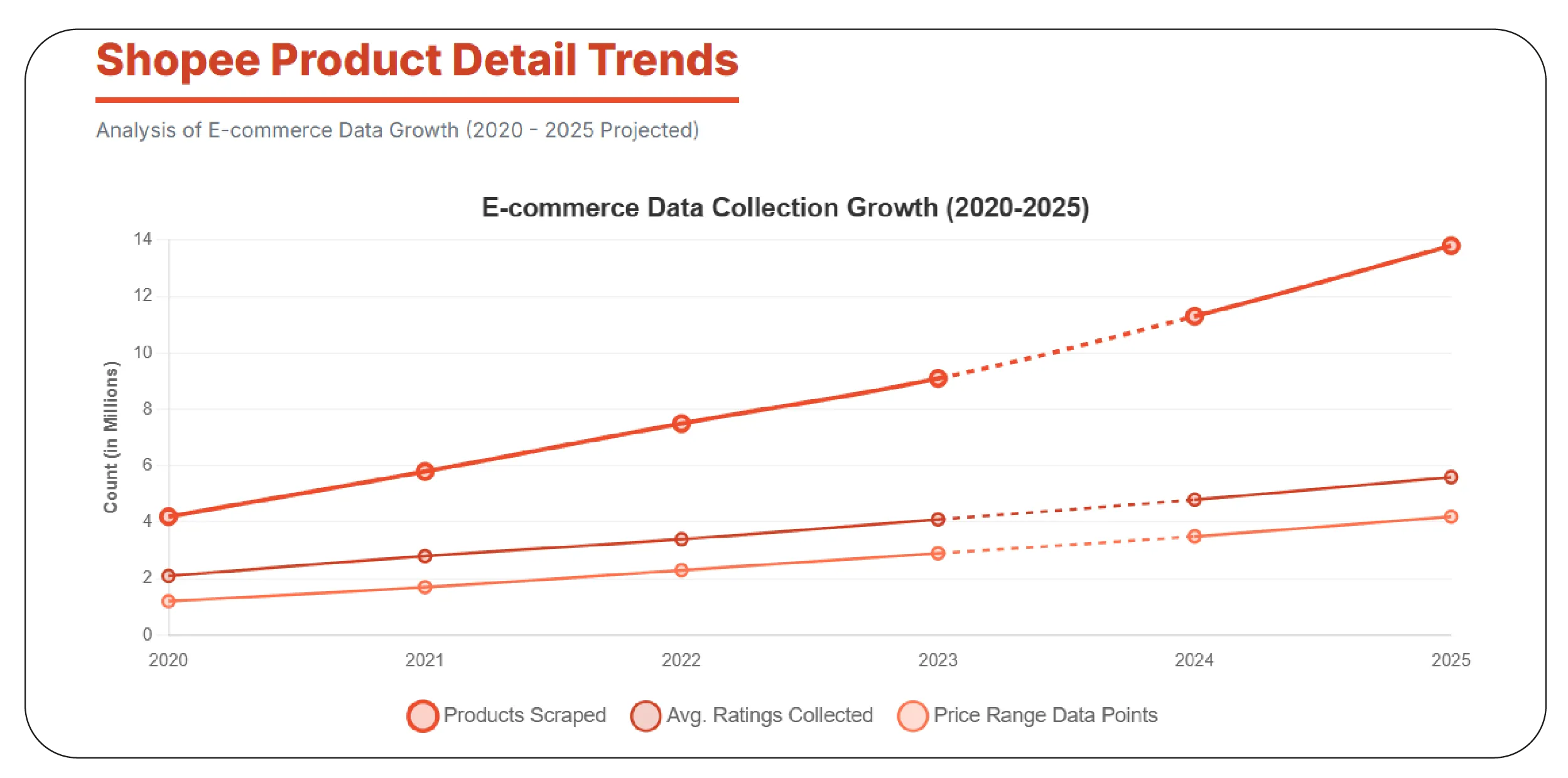 Historical data between 2020–2025 shows steady growth in the number of e-commerce platforms tracked, highlighting the increasing importance of multi-channel data.