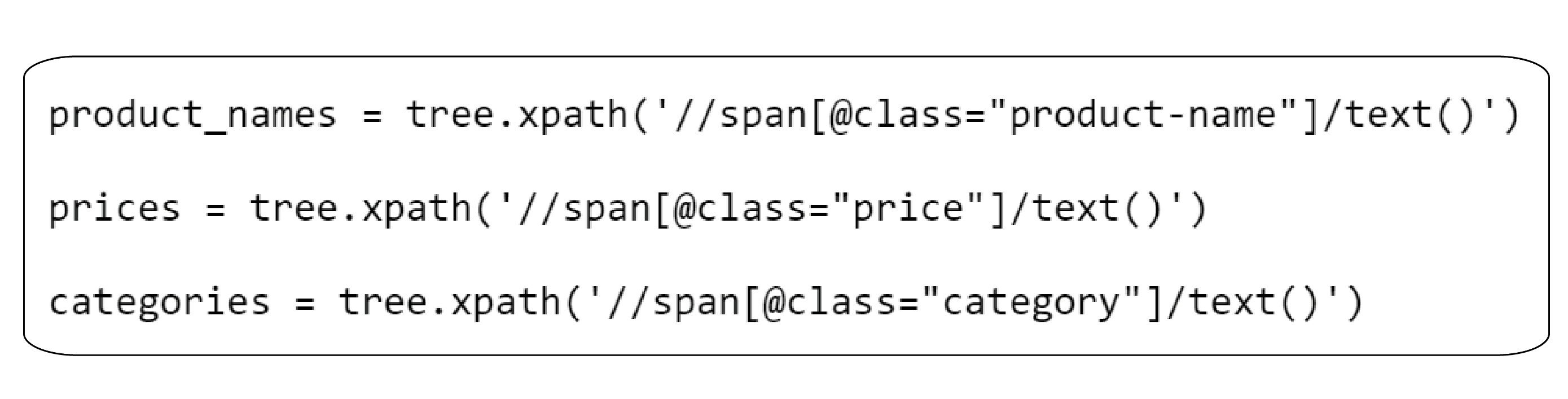 Using XPaths, you can target specific elements on the webpage. For instance, XPath can extract product names, prices, and categories from the page.